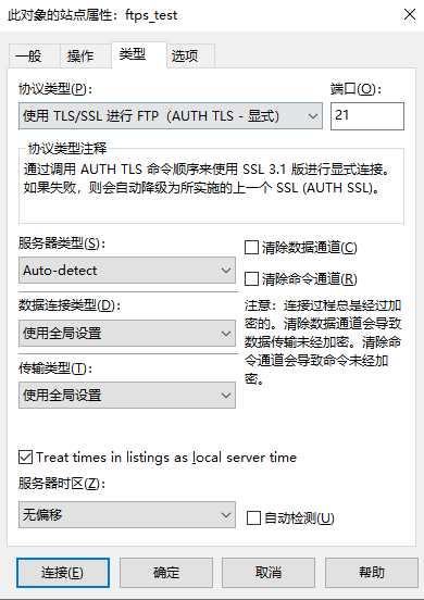 ftpsClient.setFileType(FTP.BINARY_FILE_TYPE); ftpsClient.setControlEncoding(LOCAL_CHARSET); ftpsClient.execPBSZ(0); ftpsClient.execPROT("P"); ftpsClient.enterLocalPassiveMode(); } catch (IOException e) { log.error("ftps连接创建失败"); e.printStackTrace(); return null; } return ftpsClient; }